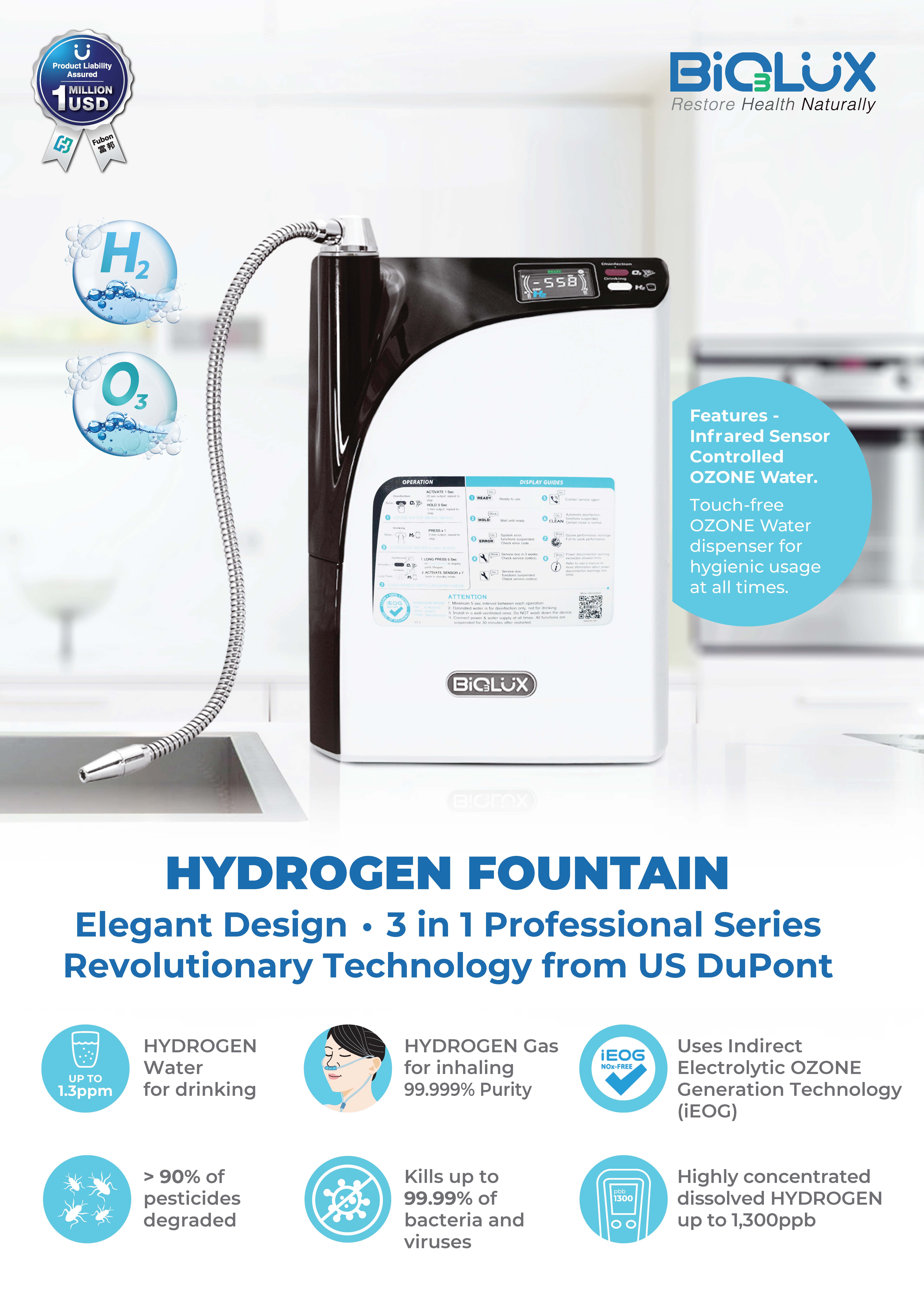 HYDROGEN Fountain provides HYDROGEN water for drinking, HYDROGEN gas for inhalation and OZONE water for disinfection and food ingredients purification.