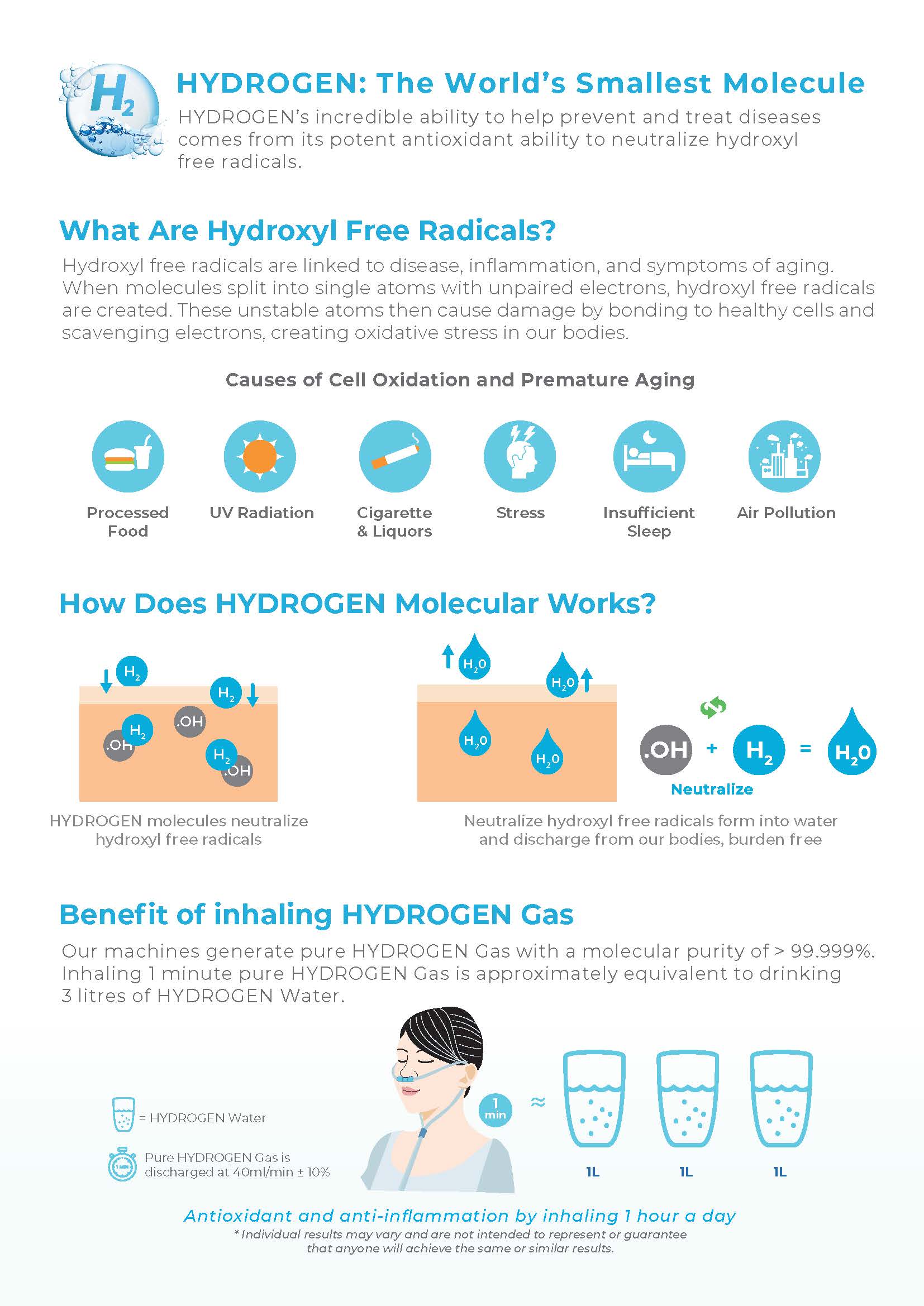 HYDROGEN is a strong antioxidant that can neutralize toxic free radicals from our body, proven by over 1000 articles. You can enjoy antioxidant, anti-inflammatory and anti-aging therapeutic effect through drinking HYDROGEN water and inhaling HYDROGEN gas.