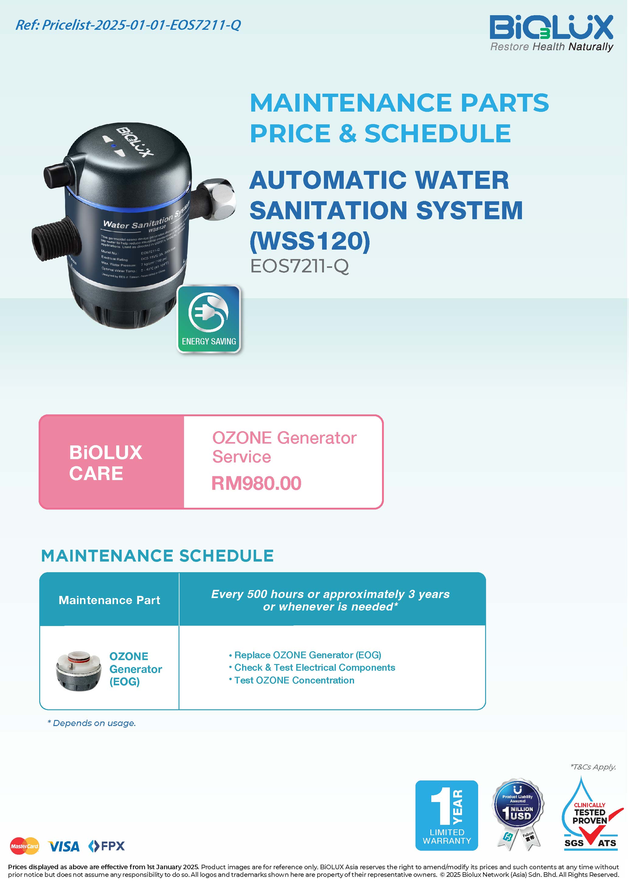 As the red light slowly blinking on the WSS120, it indicates the OZONATED generator replacement is due.