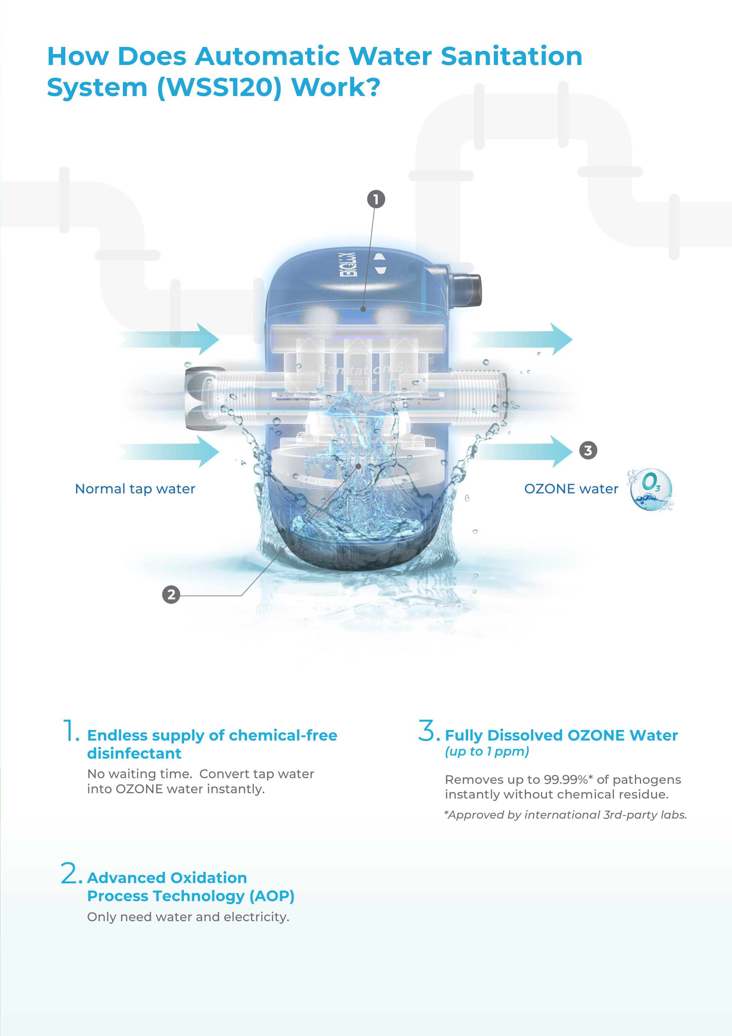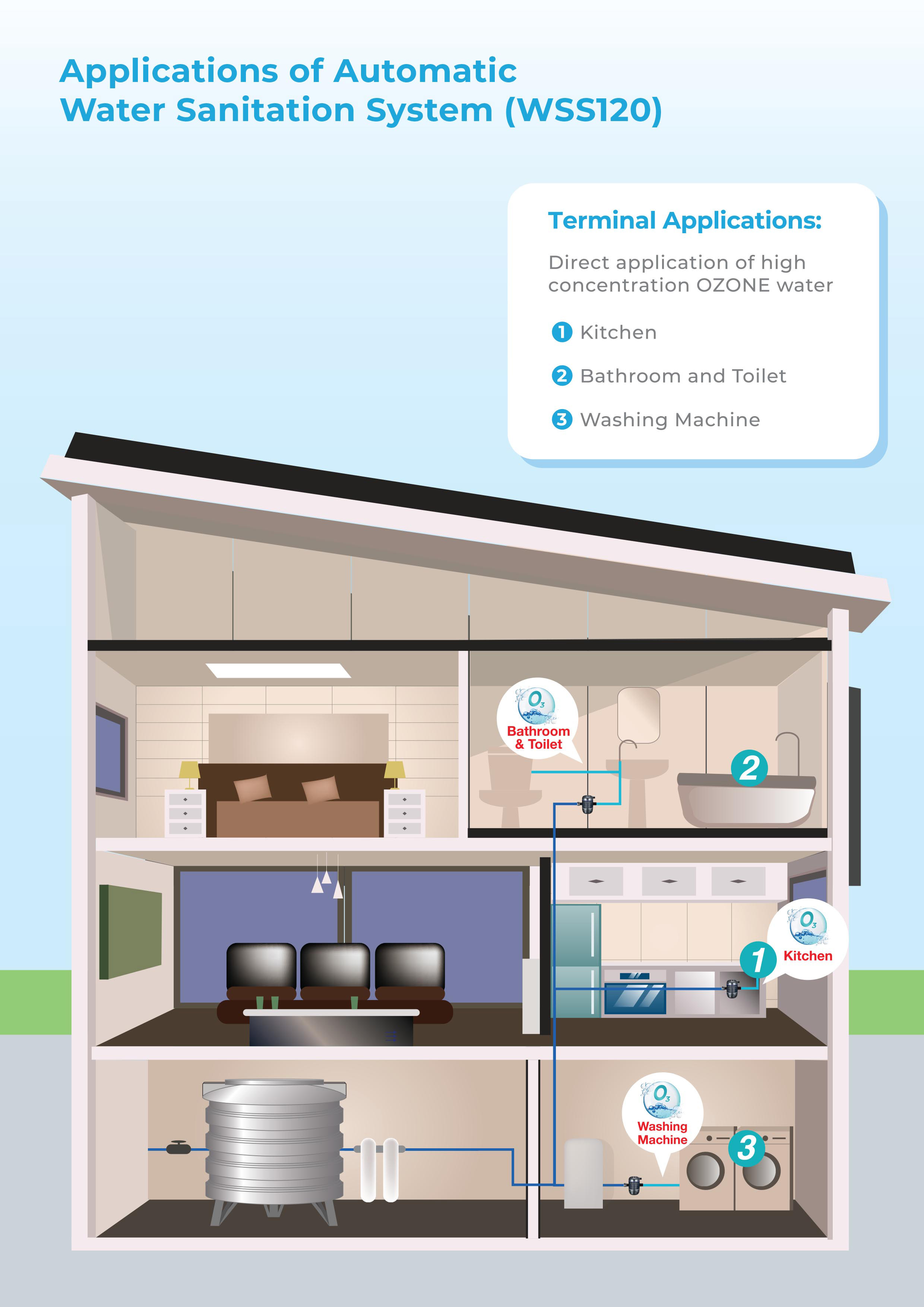 Water Sanitation System (WSS120) converts tap water into OZONE water instantly, providing endless supply of chemical free disinfectant to keep you protected.