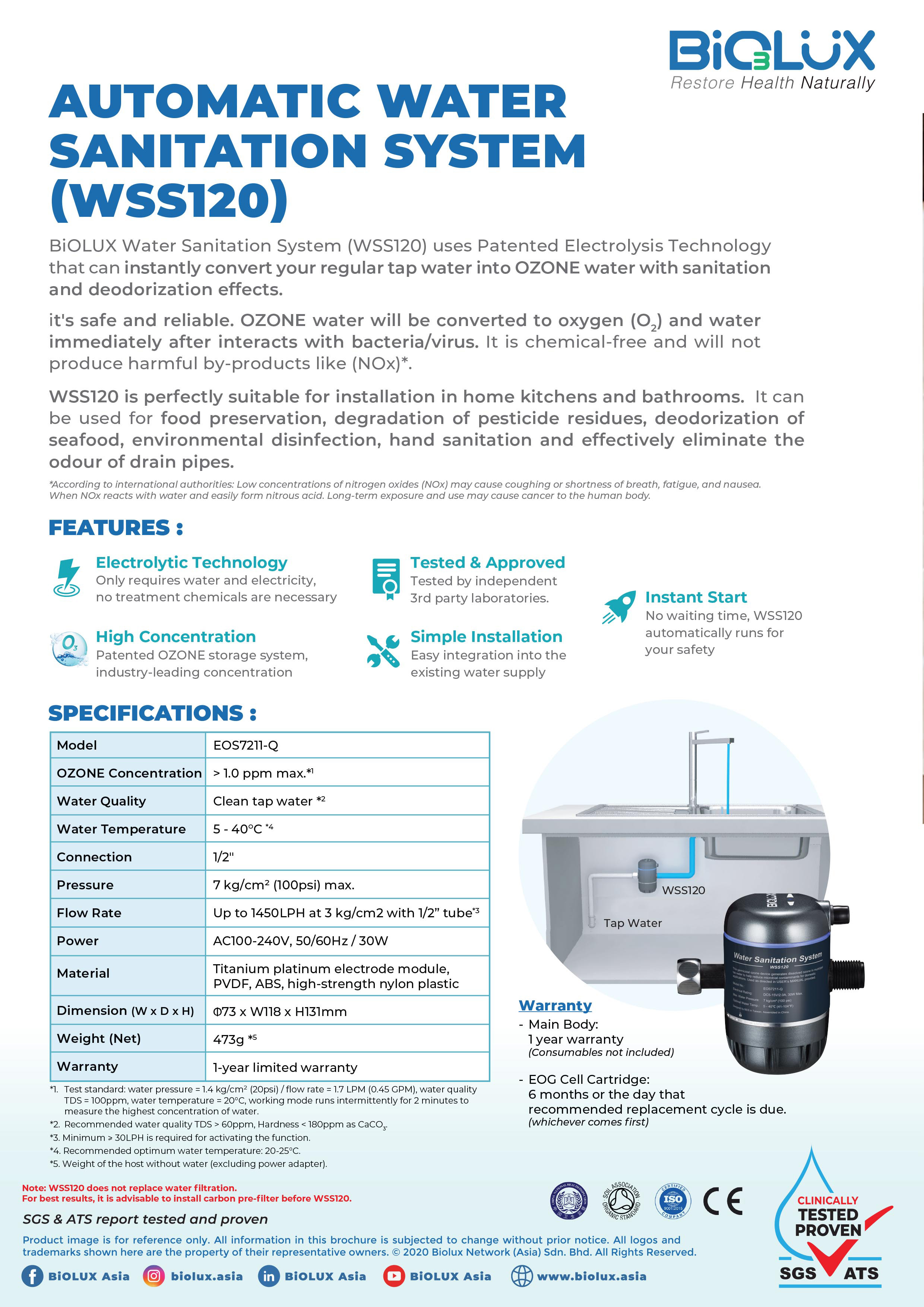 BiOLUX OFP is design specifically to soak utensils, fruits, vegetables, meat, fish, poultry, and seafood, but BiOLUX WSS120 is design to disinfect and remove odours for any objects, food or surfaces through running water.